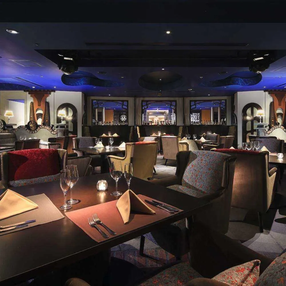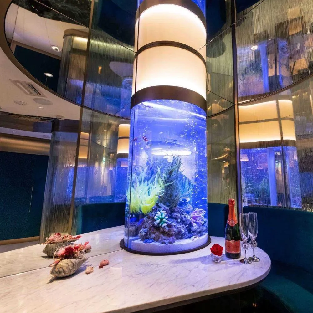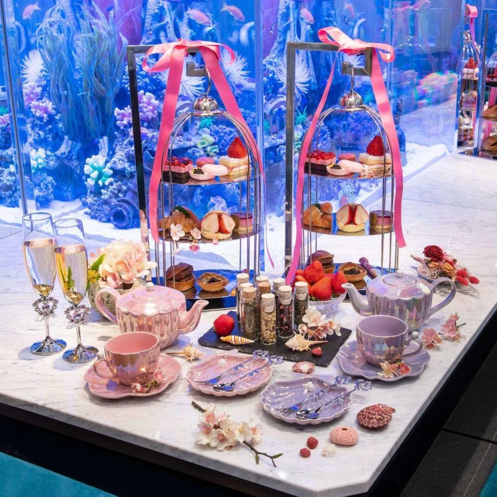 ロマンティックな水に囲まれた店内は、潜水艦内の豪華客船の船室をコンセプトに作られています。ライトアップされた大きな水槽は、まるで海中クルージングしている様なラグジュアリーな空間を演出! 特別感のあるアフタヌーンティーが楽しめちゃう夏におすすめの推し活スポットです!♡